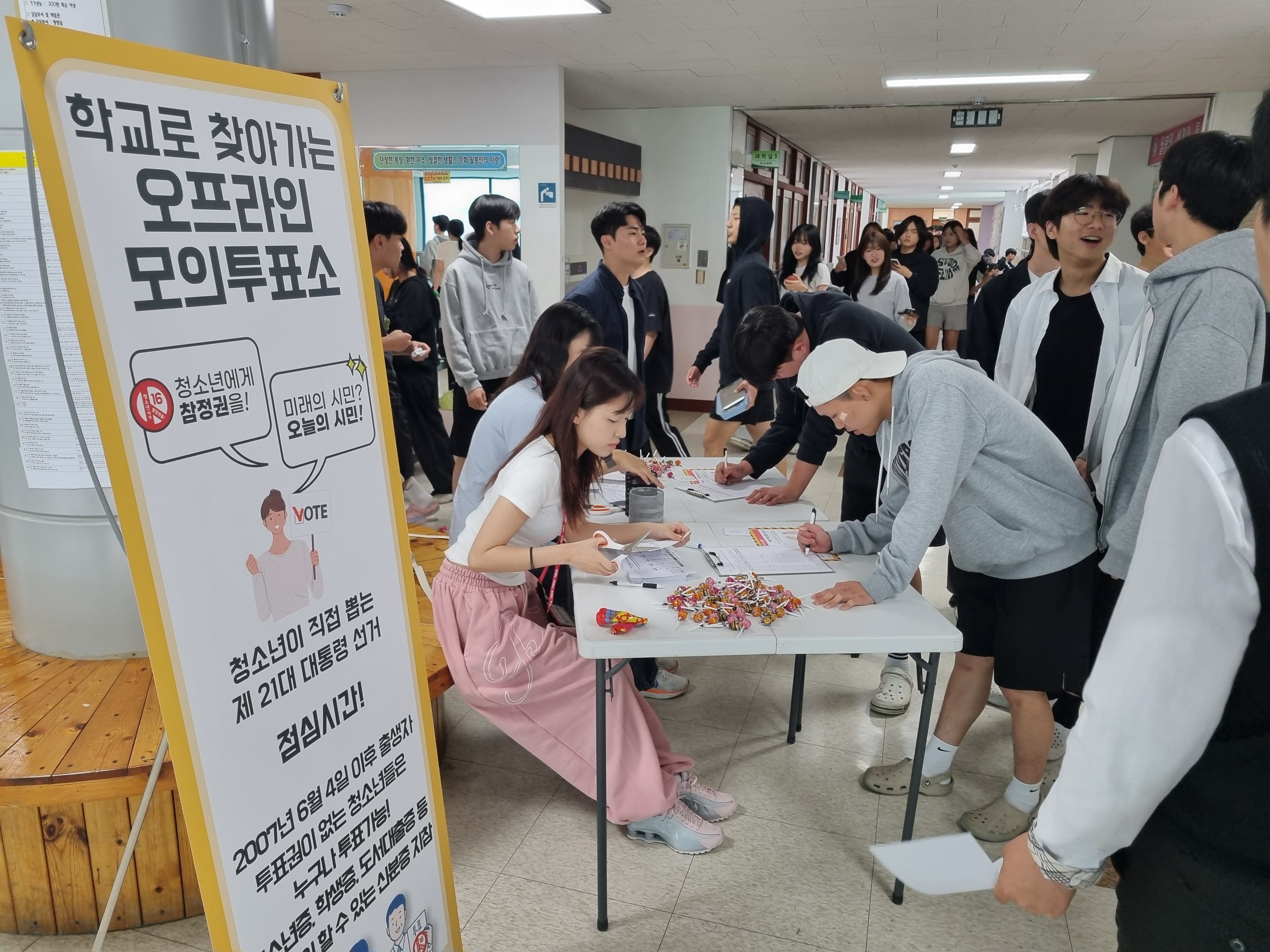 첫번째 학교로 찾아가는 청소년 모의투표(사전투표)는 5월 28일(수) 월봉고등학교 2층 로비에서 점심시간을 활용해 진행됐습니다. 월봉고등학교에서는 222명의 학생들이 모의투표에 참여했습니다.