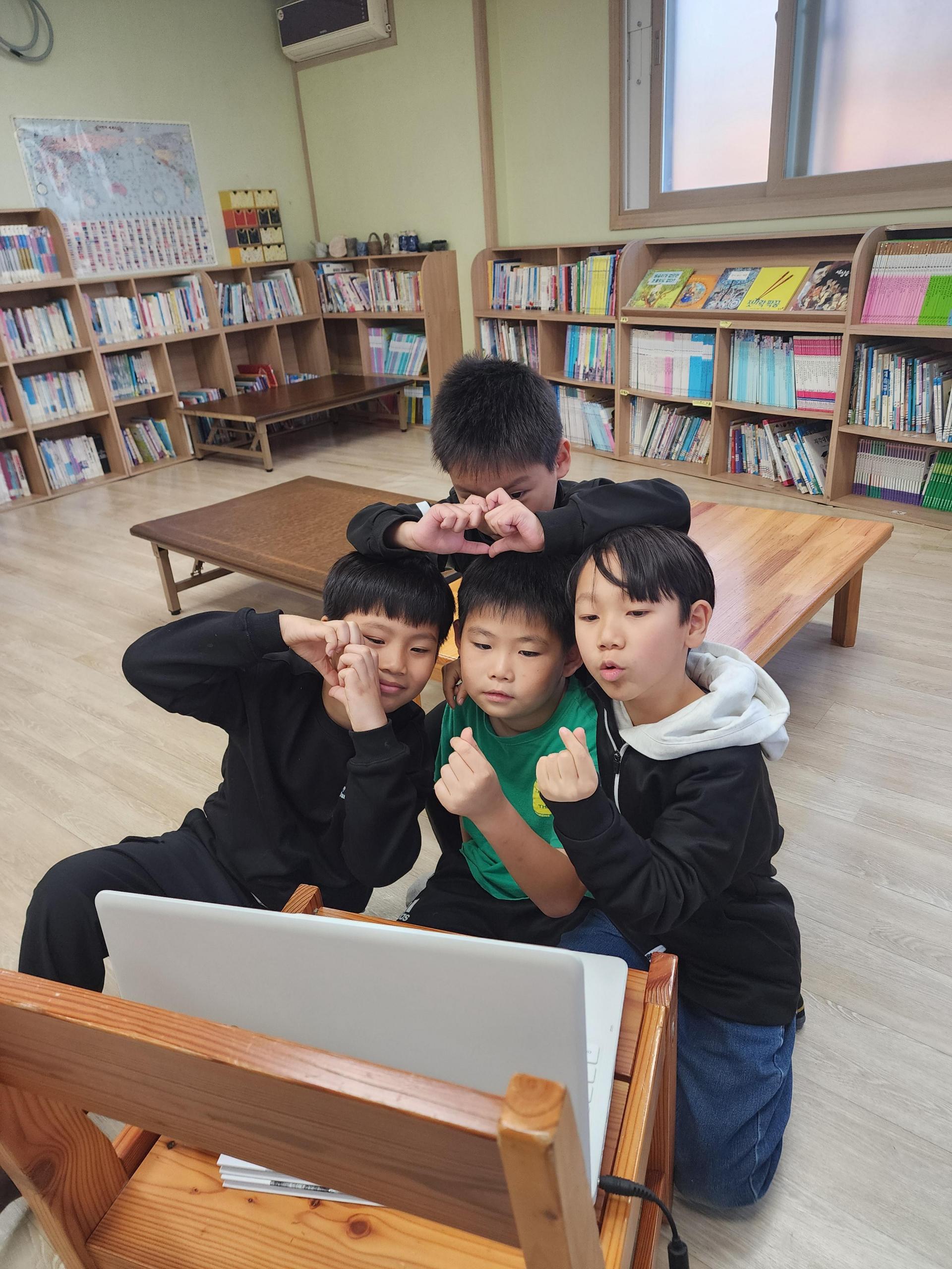 노트북을 연결해 ZOOM에 연결후 아동들의 휴대용전화기를 한명씩 화면으로 접속을 도와줍니다.